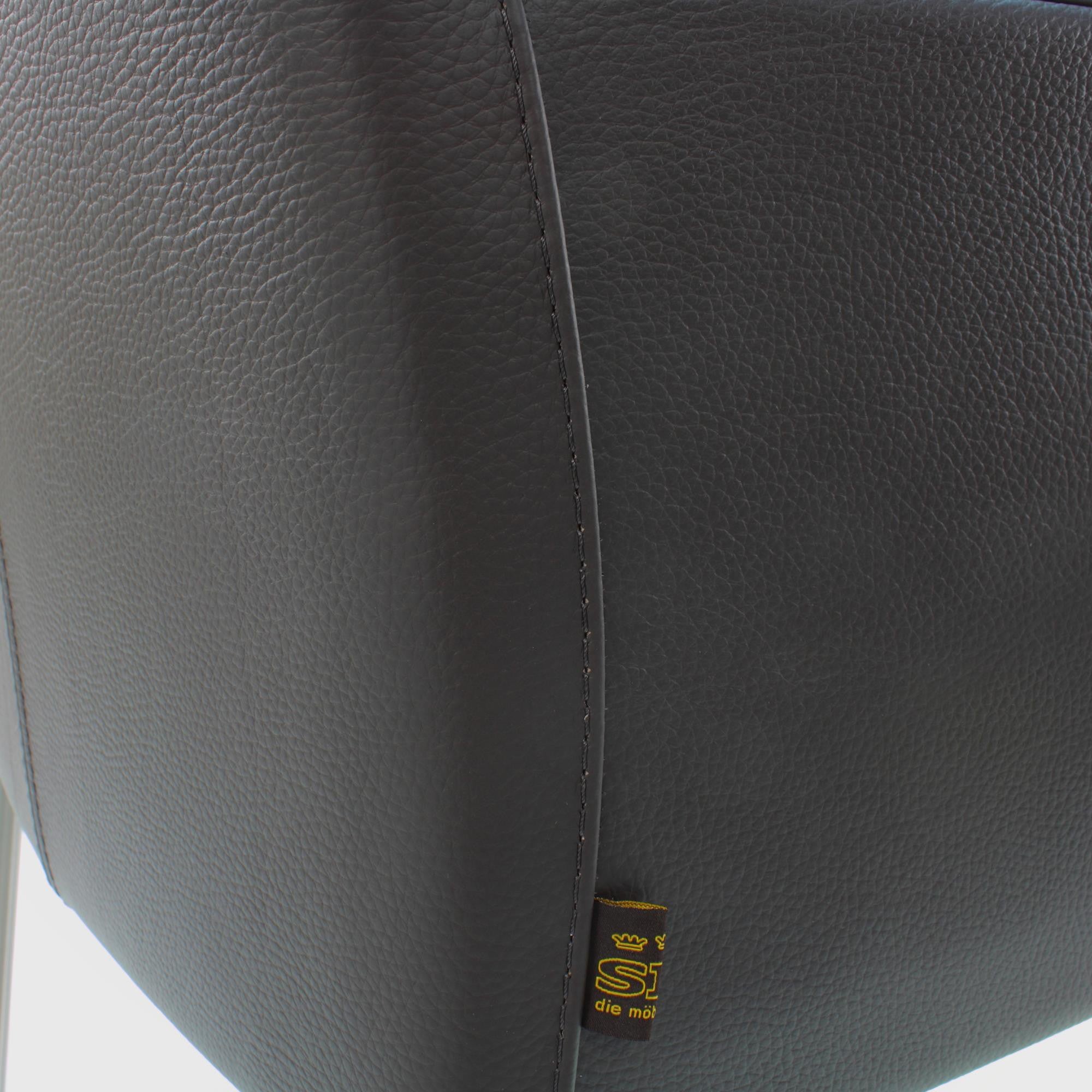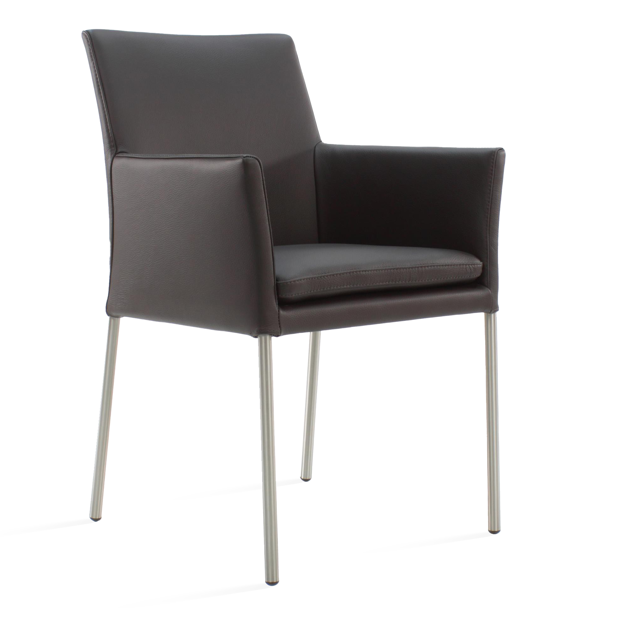 Ein stabiler und hochwertiger Lederstuhl mit Armlehnen und gebürsteten Edelstahl Füßen. Die Stuhlserie Ricco der Möbelmarke SIX zeichnet sich durch stabil gearbeitete Stuhlbeine in gebürstetem Edelstahl und dem besonderen Design aus. Höchste Verarbeitungsqualität und handwerkliches Können sorgen für ein Generations - Möbelstück. Ein in Handarbeit gefertigter Armlehnstuhl für den Wohn- und Geschäftsbereich als Esszimmersessel, Besuchersessel oder Bürosessel.