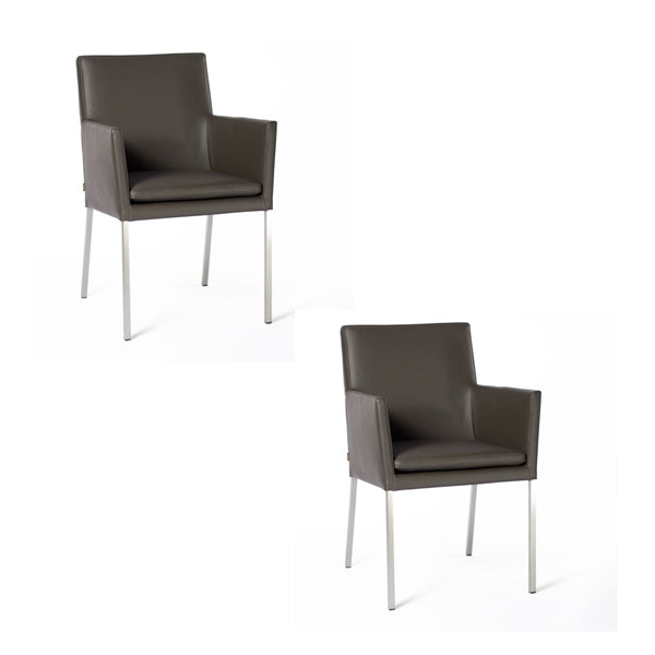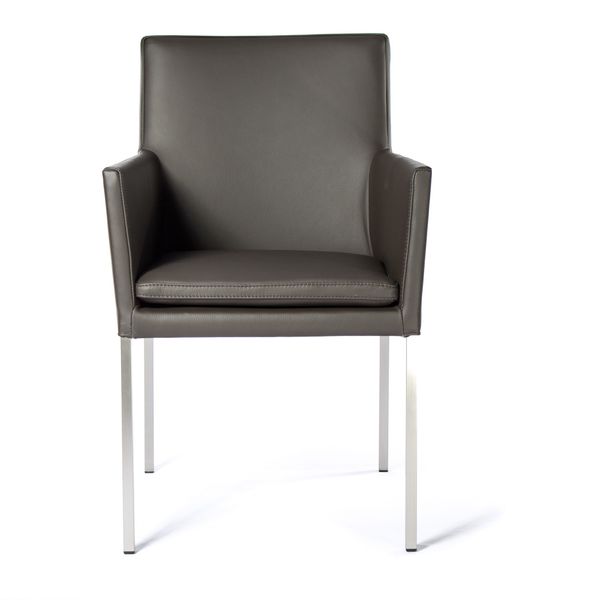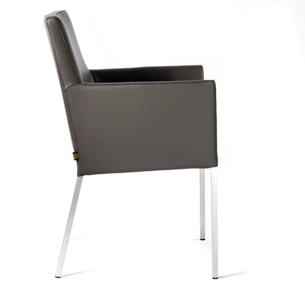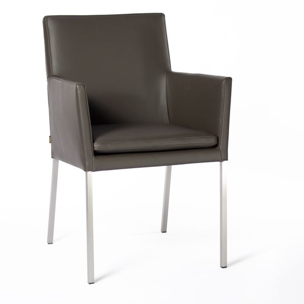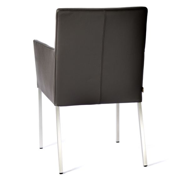 Ein stabiler und wertiger Lederstuhl mit Armlehnen und gebürsteten Edelstahl Füßen. Die Stuhlserie Stella der Möbelmarke SIX zeichnet sich durch stabil gearbeitete Stuhlbeine in gebürstetem Edelstahl und dem besonderen Design aus. Höchste Verarbeitungsqualität und handwerkliches Können sorgen für ein Generations - Möbelstück. Ein in Handarbeit gefertigter Armlehnstuhl für den Wohn- und Geschäftsbereich als Esszimmersessel, Besuchersessel oder Bürosessel.