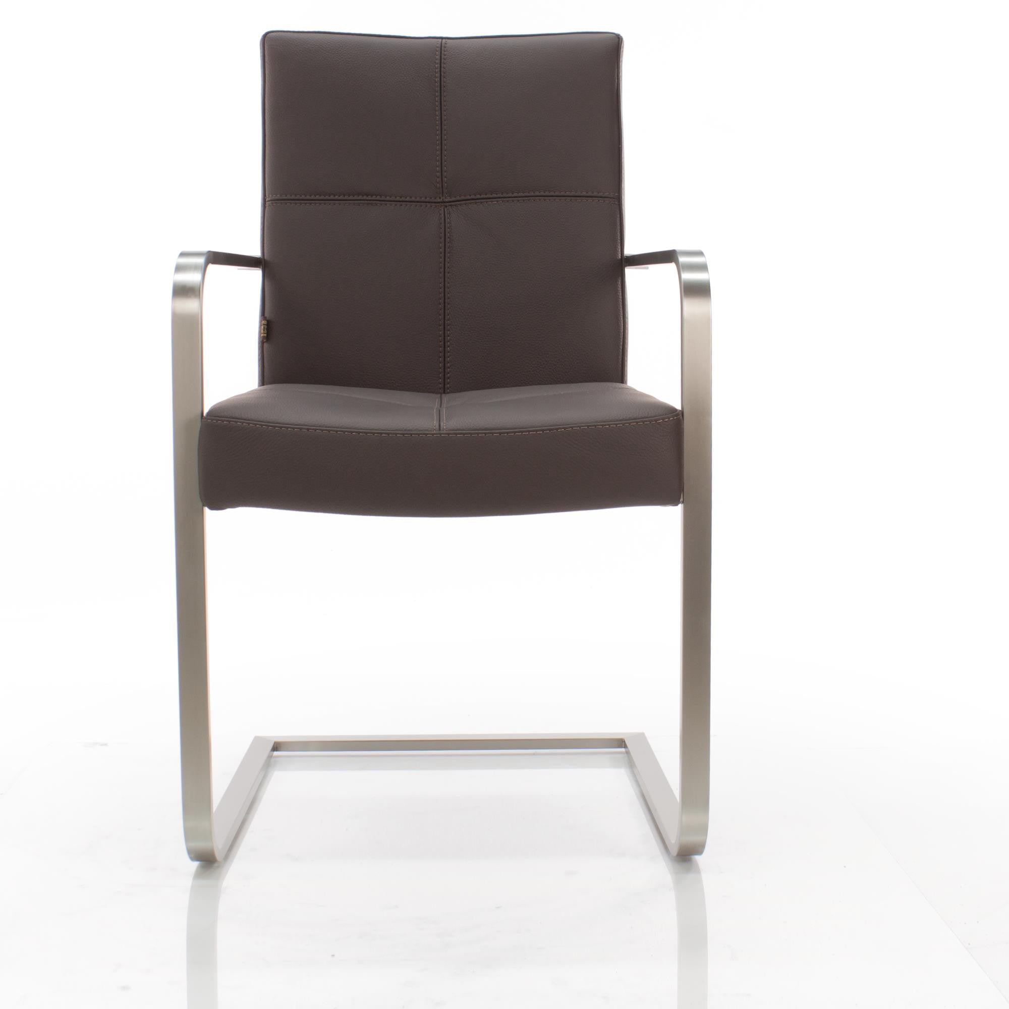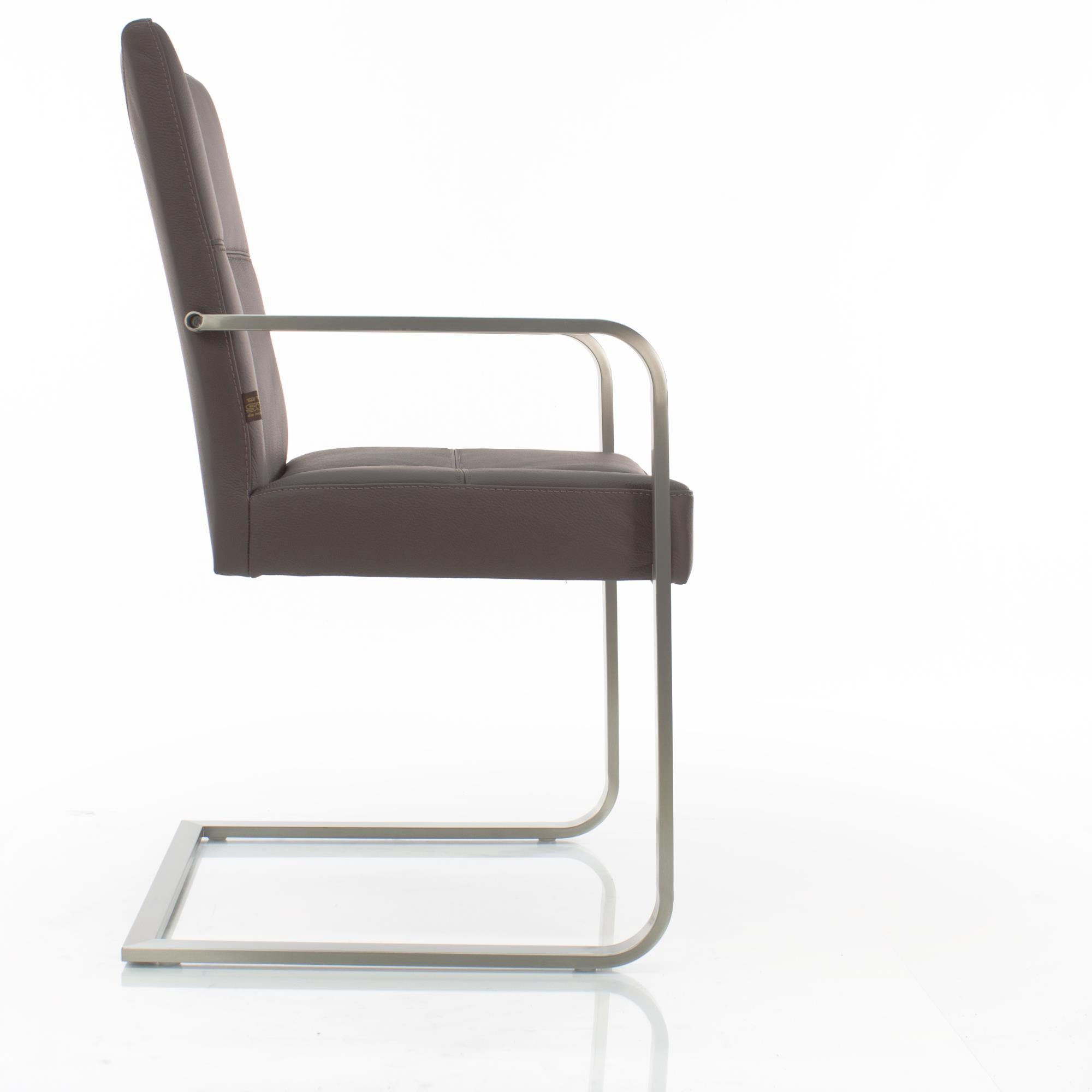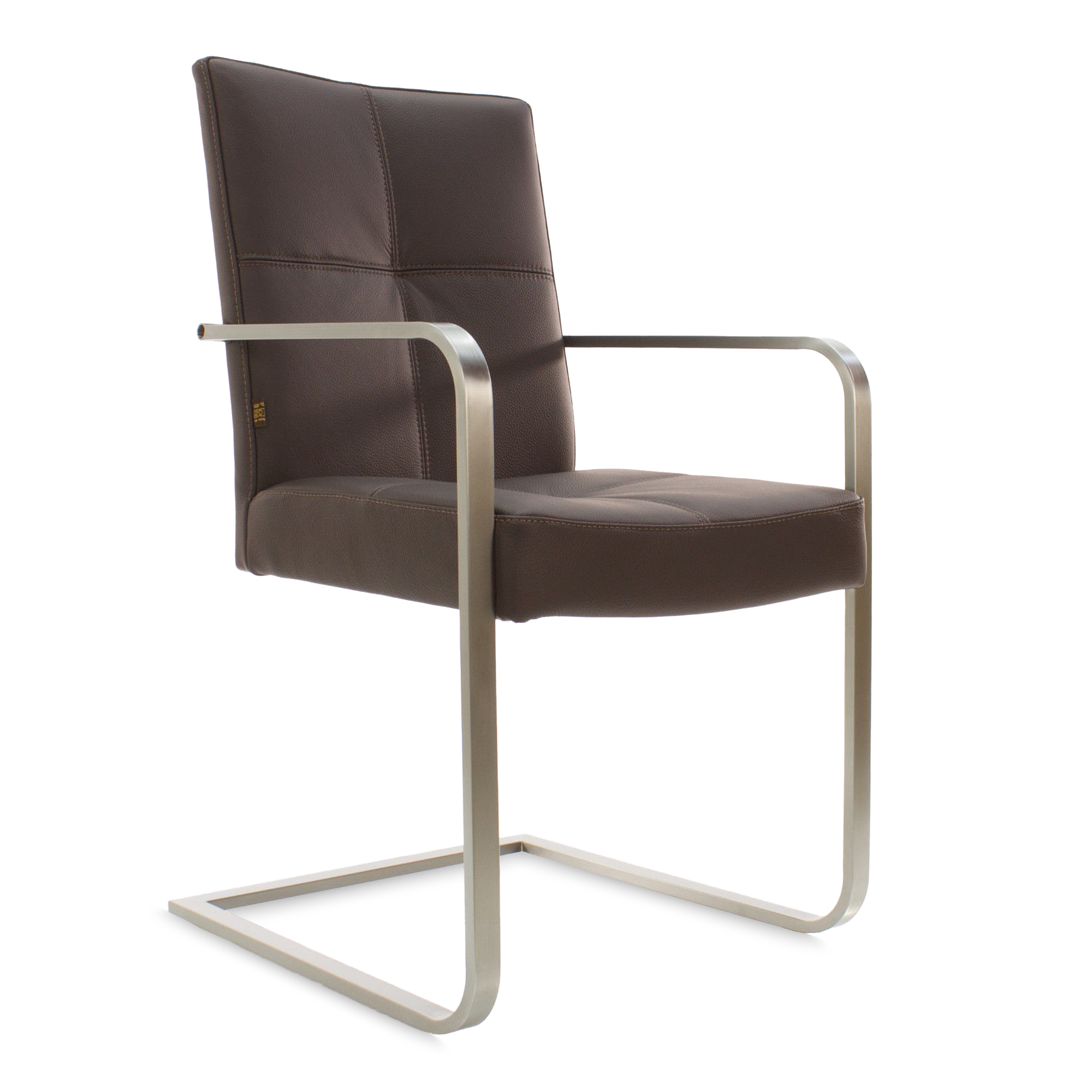 Moderner Freischwinger mit Armlehnen in Rindsleder, gebürstetem Edelstahlgestell. Dieser Armlehnstuhl ist besonders stabil aufgebaut und das verarbeitete Rindsleder ist aufwendig gearbeitet und von hoher Güte. Dieser Armlehnstuhl ist auf einem langlebigen und robusten Edelstahlgestell aufgebaut. Dieses passt sich durch die gebürstete Ausführung hervorragend in die Gesamtoptik ein. Durch die Ausführung in Edelstahl ist dieser Freischwinger bis 130 KG geeignet.
