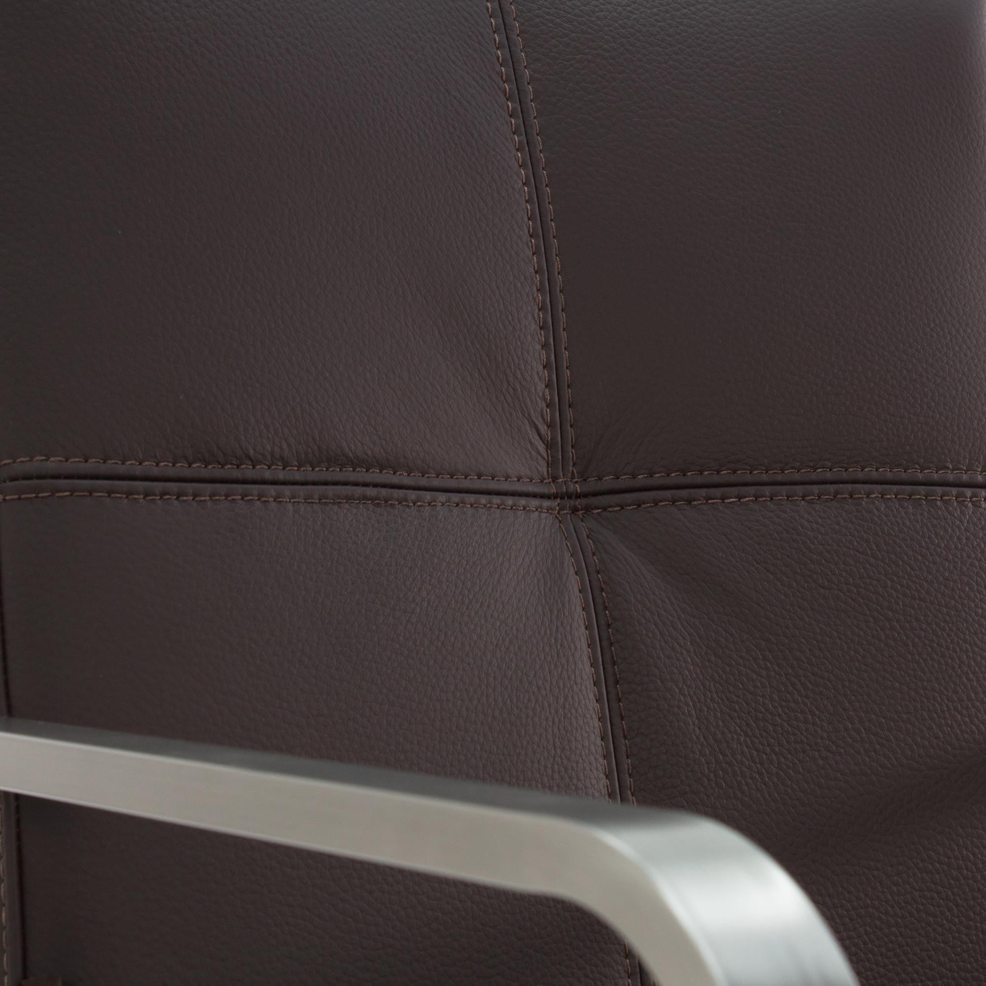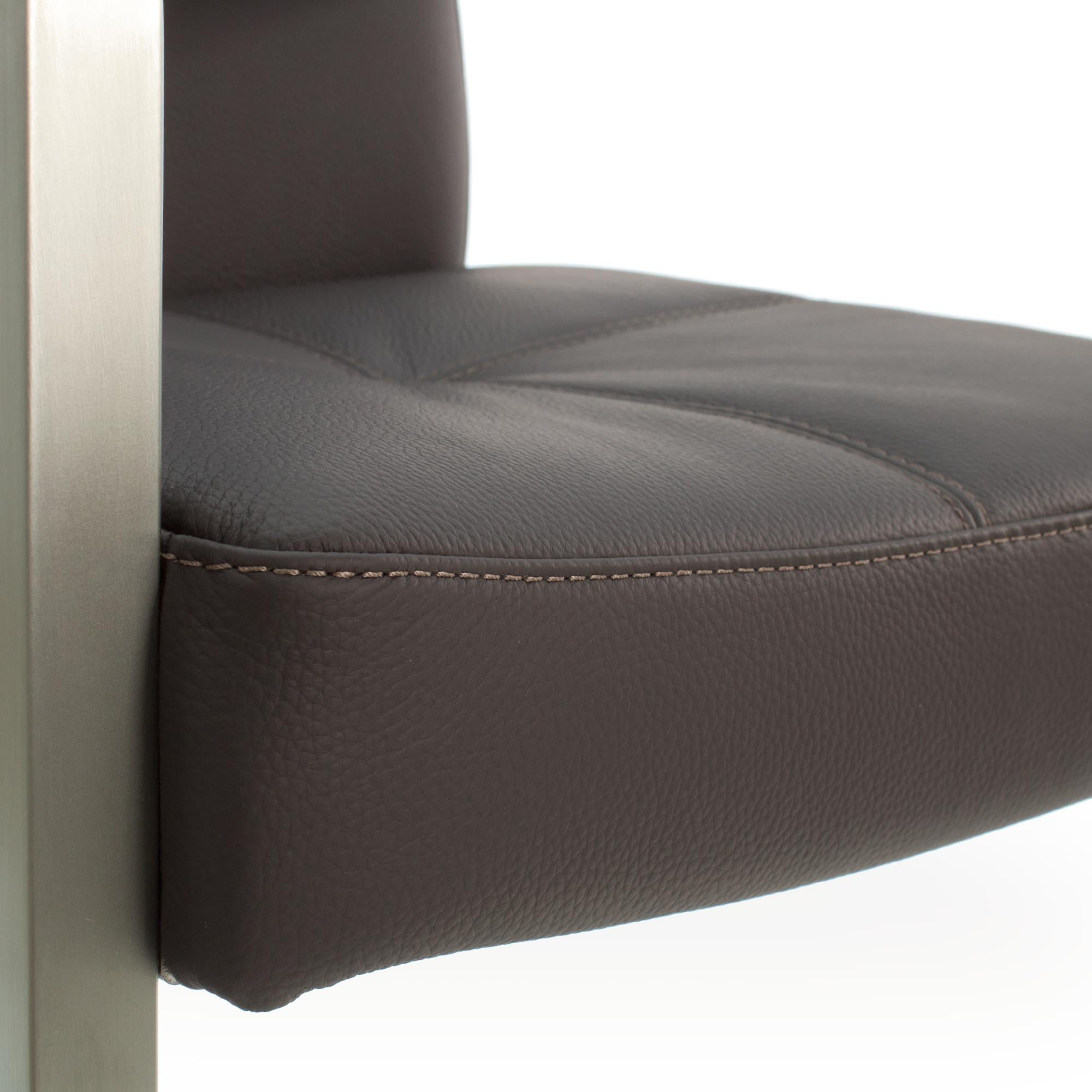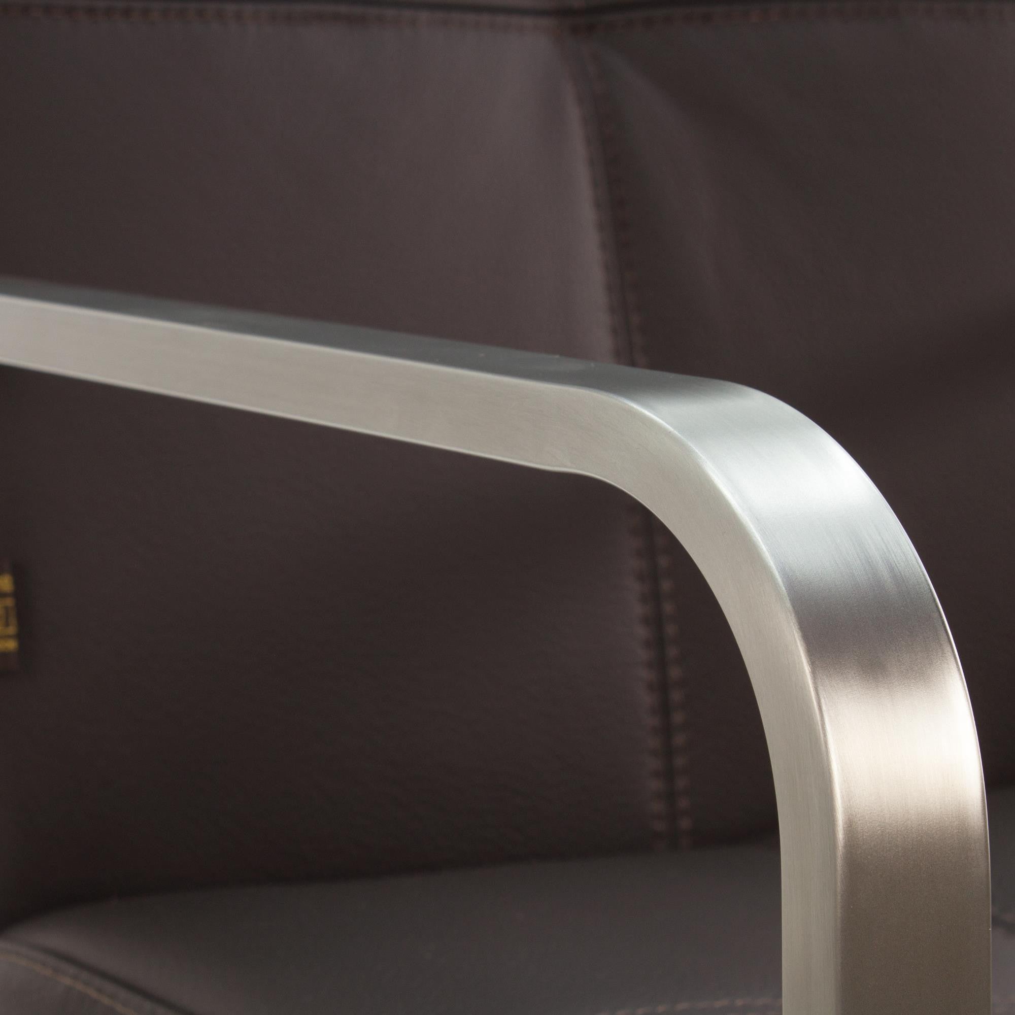 Moderner Freischwinger mit Armlehnen in Rindsleder, gebürstetem Edelstahlgestell. Dieser Armlehnstuhl ist besonders stabil aufgebaut und das verarbeitete Rindsleder ist aufwendig gearbeitet und von hoher Güte. Dieser Armlehnstuhl ist auf einem langlebigen und robusten Edelstahlgestell aufgebaut. Dieses passt sich durch die gebürstete Ausführung hervorragend in die Gesamtoptik ein. Durch die Ausführung in Edelstahl ist dieser Freischwinger bis 130 KG geeignet.