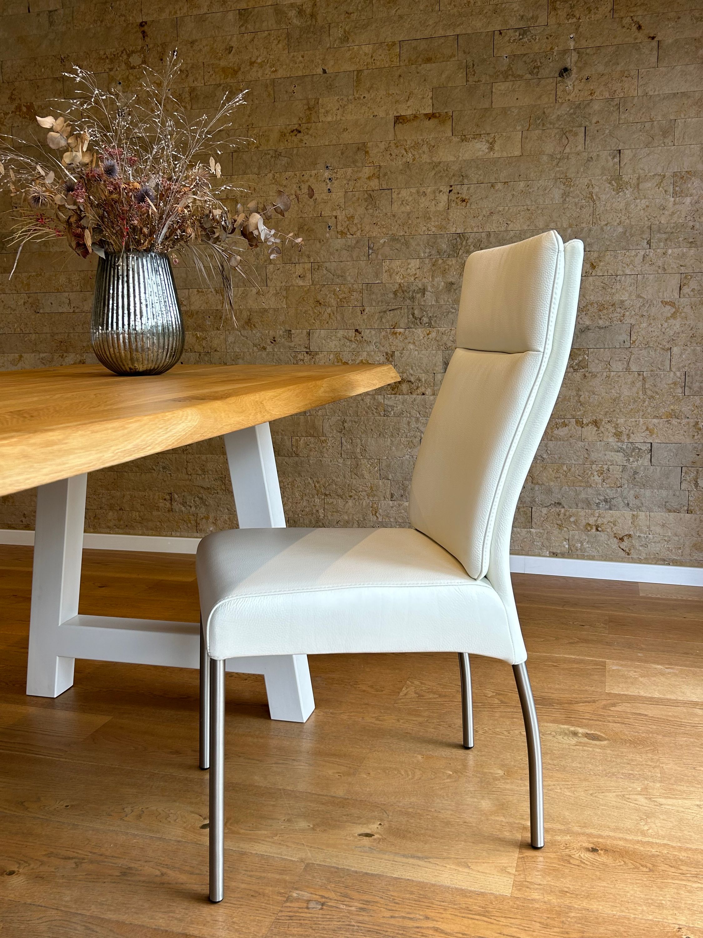 Design - Lederstuhl mit geschmeidigem Rindsleder Weiß (Eierschale) Ein massiv in Handarbeit gefertigter Lederstuhl mit stabilem Edelstahlgestell. Die Stuhlserie Gatto der Möbelmarke SIX zeichnet sich durch das filigran gearbeitete Rindsleder und dem besonderen Design aus. Höchste Verarbeitungsqualität und hanwerkliches Können sorgen für ein modernes Möbelstück. Ein in Handarbeit gefertigter Lederstuhl - Esszimmerstuhl - Besucherstuhl für den Wohn- und Geschäftsbereich. Ausgesuchtes Rindsleder mit einem angenehmen Griff und gebürstetes Edelstahl.