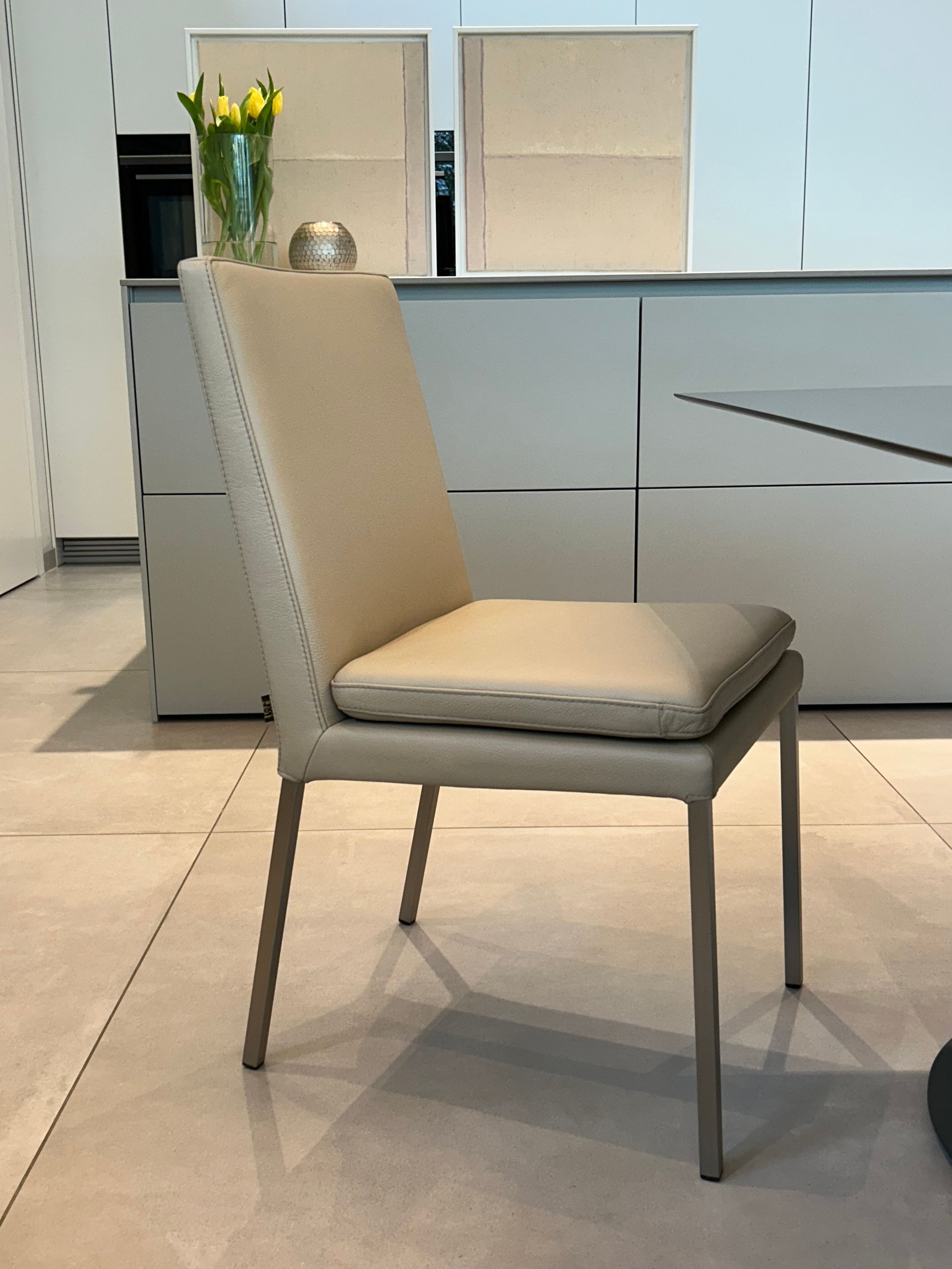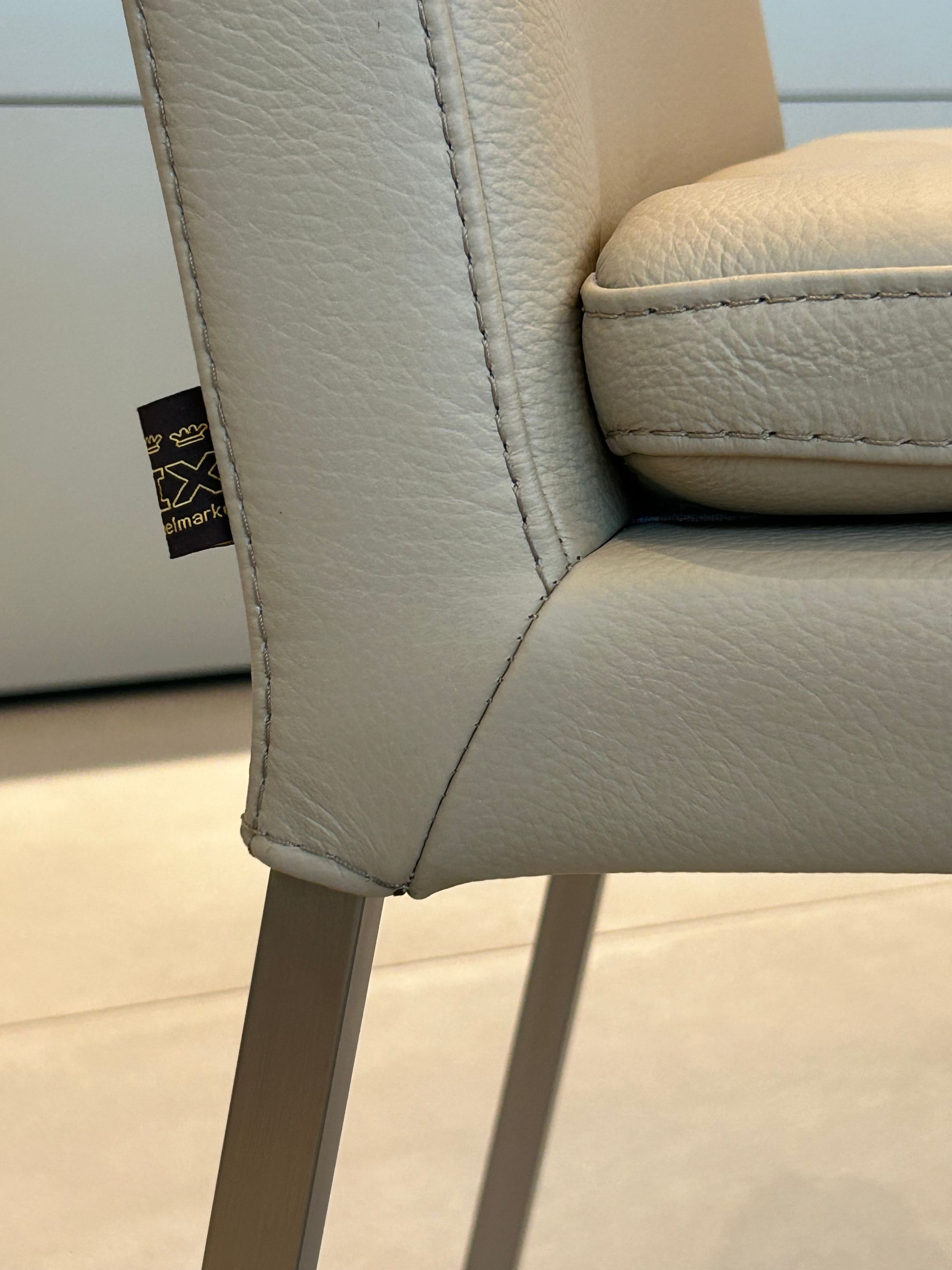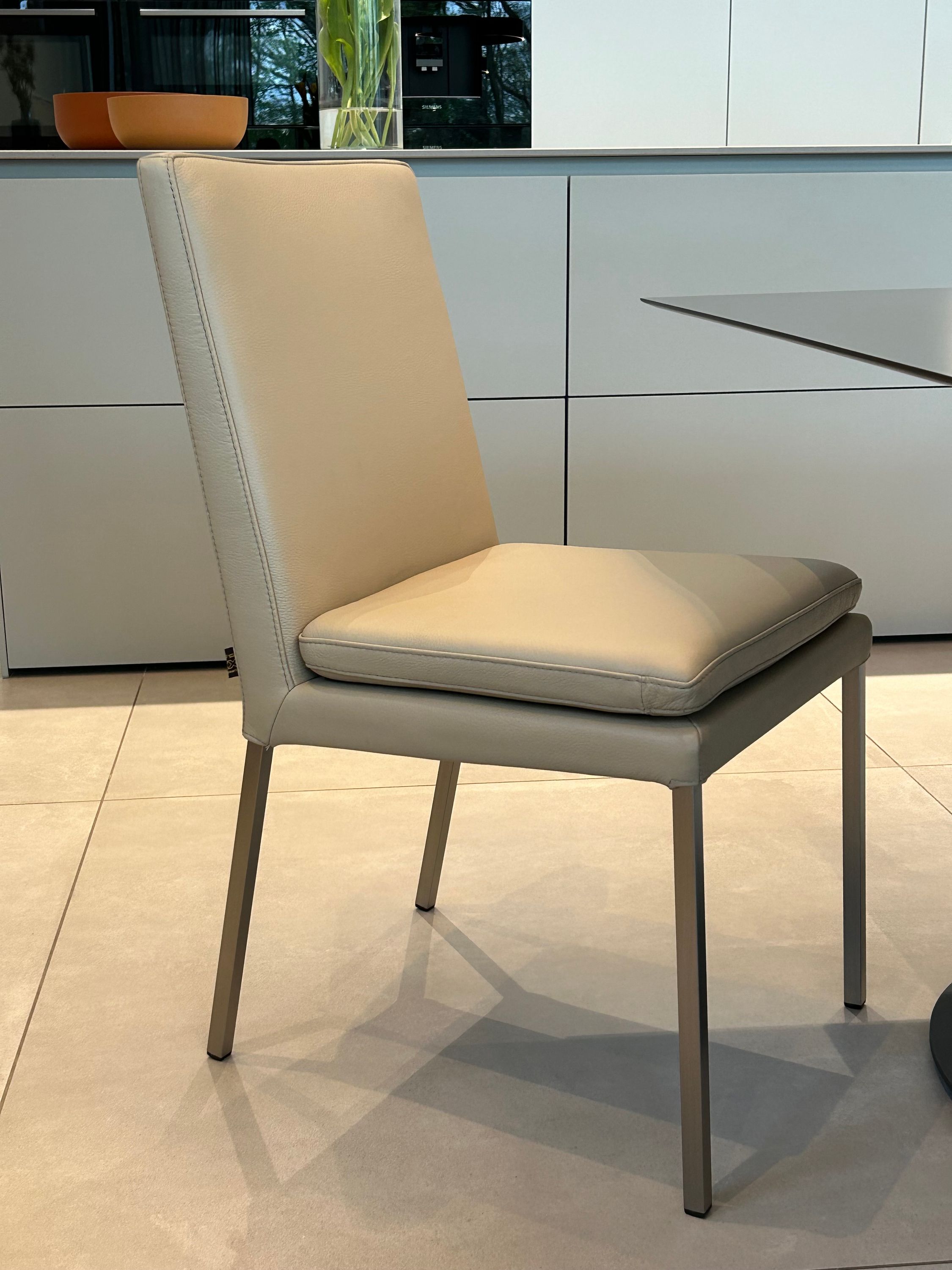 Ein stabiler und hochwertiger Lederstuhl mit gebürsteten Edelstahl Füßen. Die Stuhlserie Stella der Möbelmarke SIX zeichnet sich durch stabil gearbeitete Stuhlbeine in gebürstetem Edelstahl und dem besonderen Design aus. Höchste Verarbeitungsqualität und handwerkliches Können sorgen für ein Generations - Möbelstück. Ein in Handarbeit gefertigter Lederstuhl für den Wohn- und Geschäftsbereich als Esszimmerstuhl, Besucherstuhl oder Bürostuhl. Ausgesuchtes Rindsleder mit einem angenehmen Griff und gebürstetem Edelstahl.