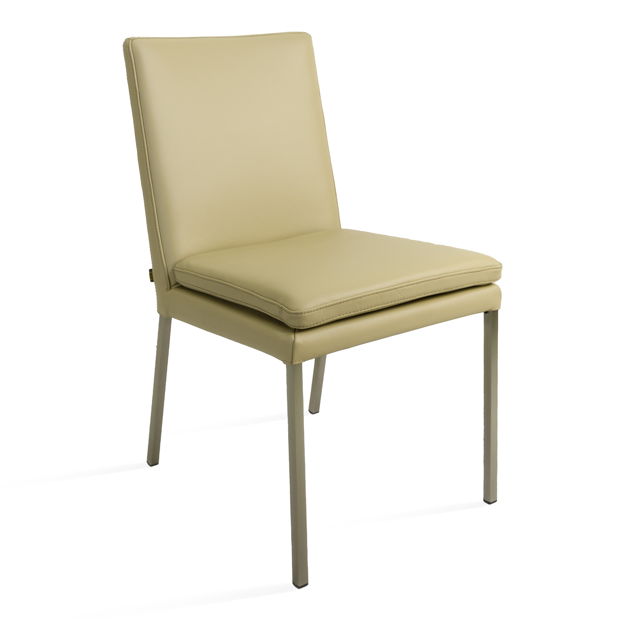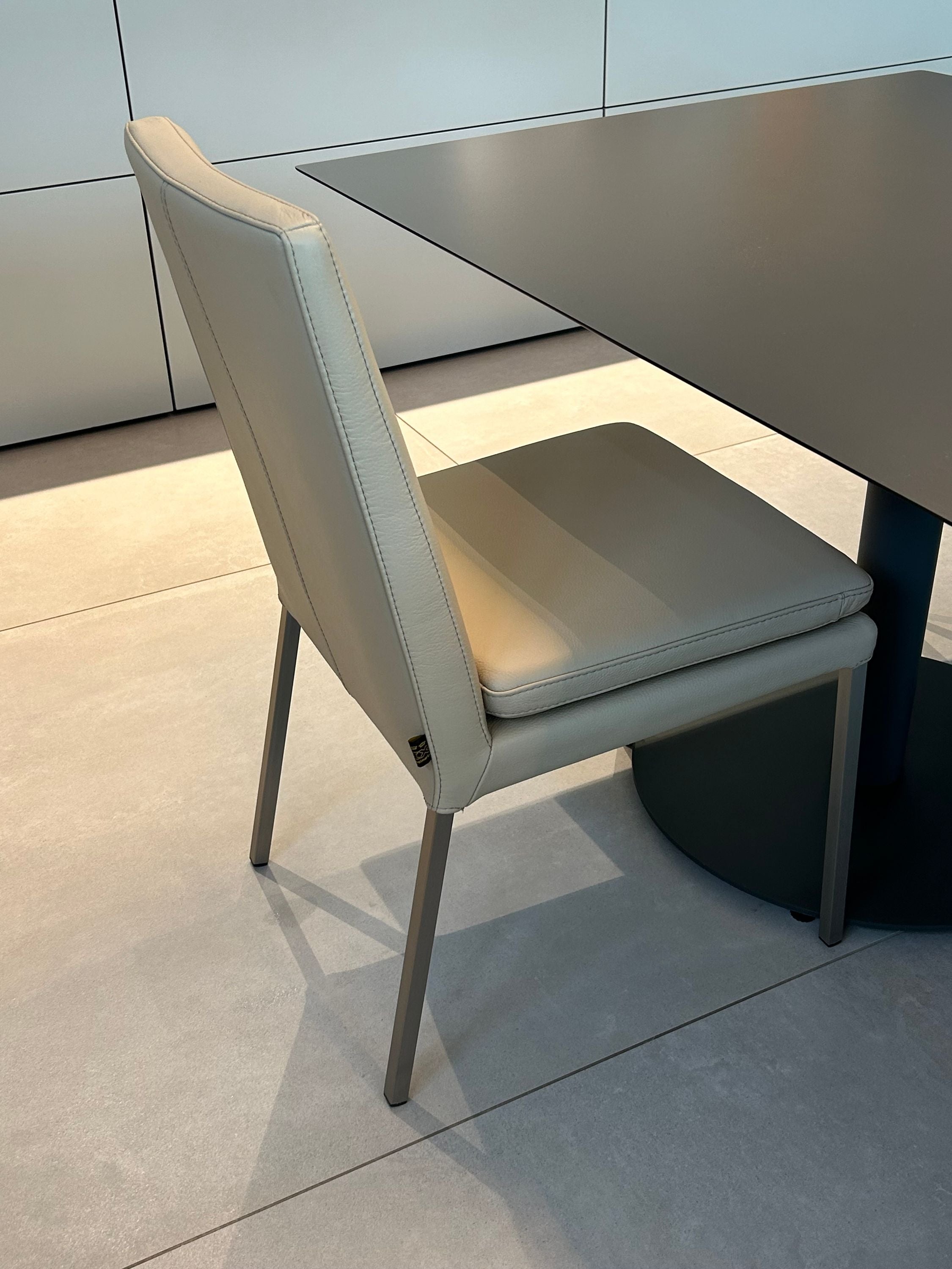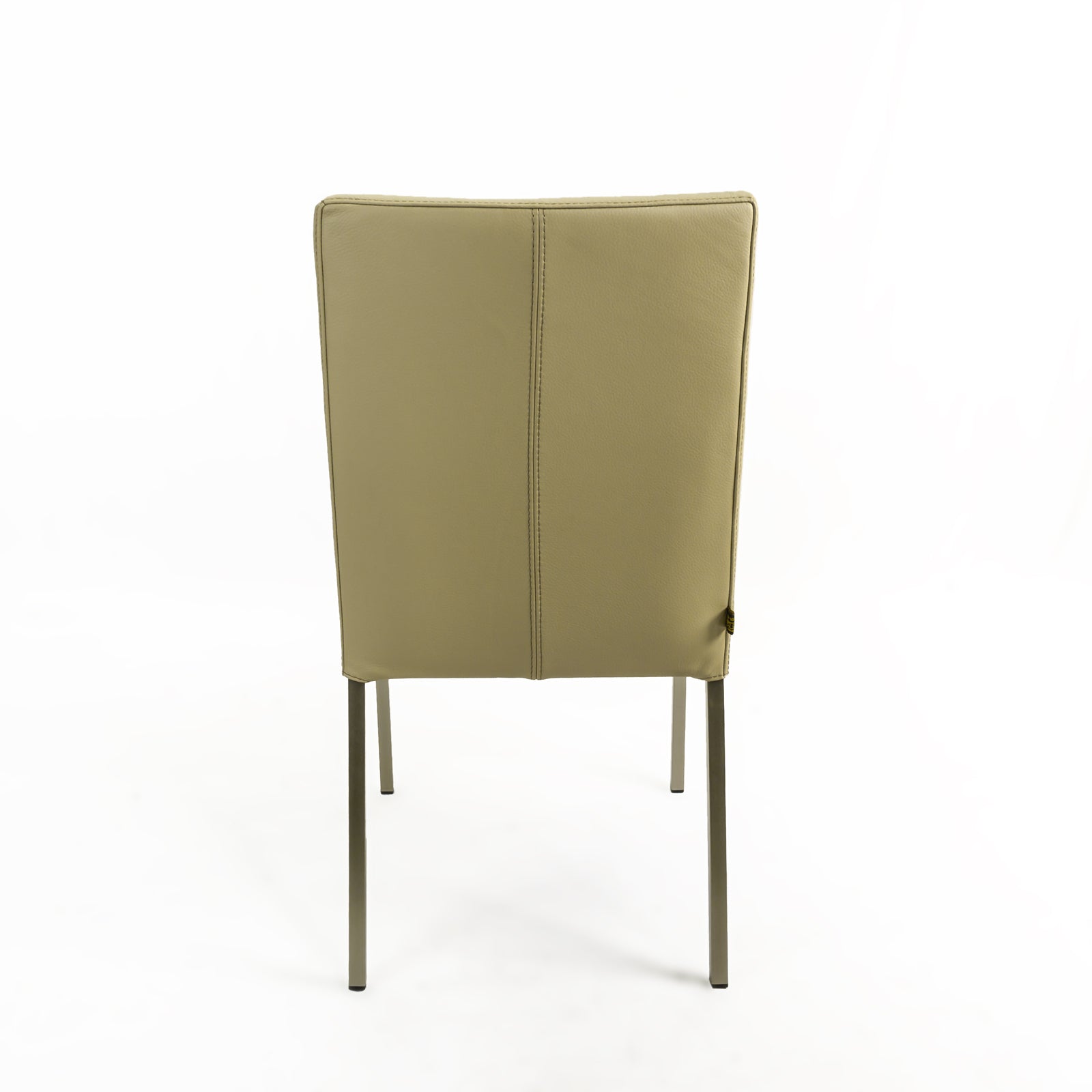 Ein stabiler und hochwertiger Lederstuhl mit gebürsteten Edelstahl Füßen. Die Stuhlserie Stella der Möbelmarke SIX zeichnet sich durch stabil gearbeitete Stuhlbeine in gebürstetem Edelstahl und dem besonderen Design aus. Höchste Verarbeitungsqualität und handwerkliches Können sorgen für ein Generations - Möbelstück. Ein in Handarbeit gefertigter Lederstuhl für den Wohn- und Geschäftsbereich als Esszimmerstuhl, Besucherstuhl oder Bürostuhl. Ausgesuchtes Rindsleder mit einem angenehmen Griff und gebürstetem Edelstahl.