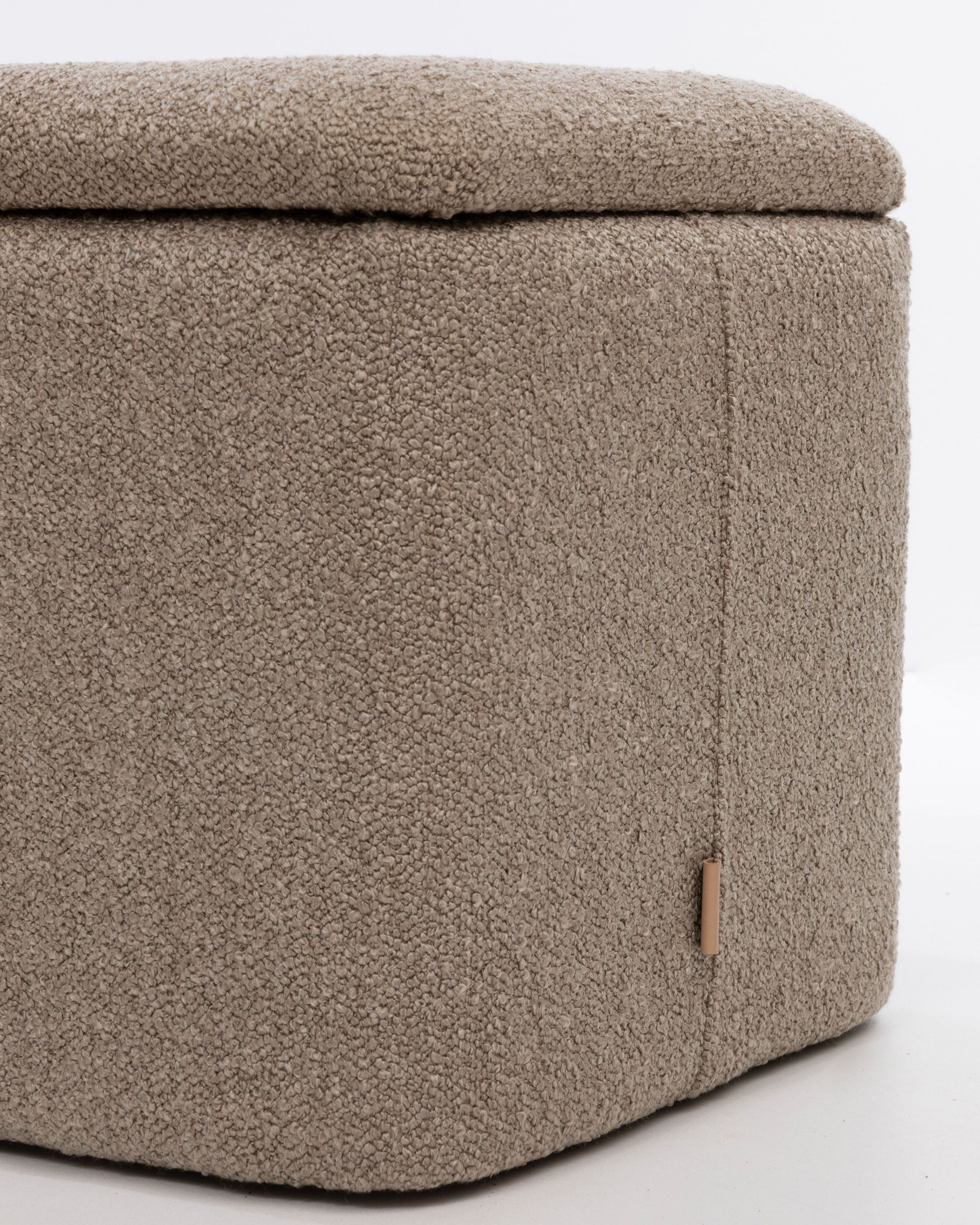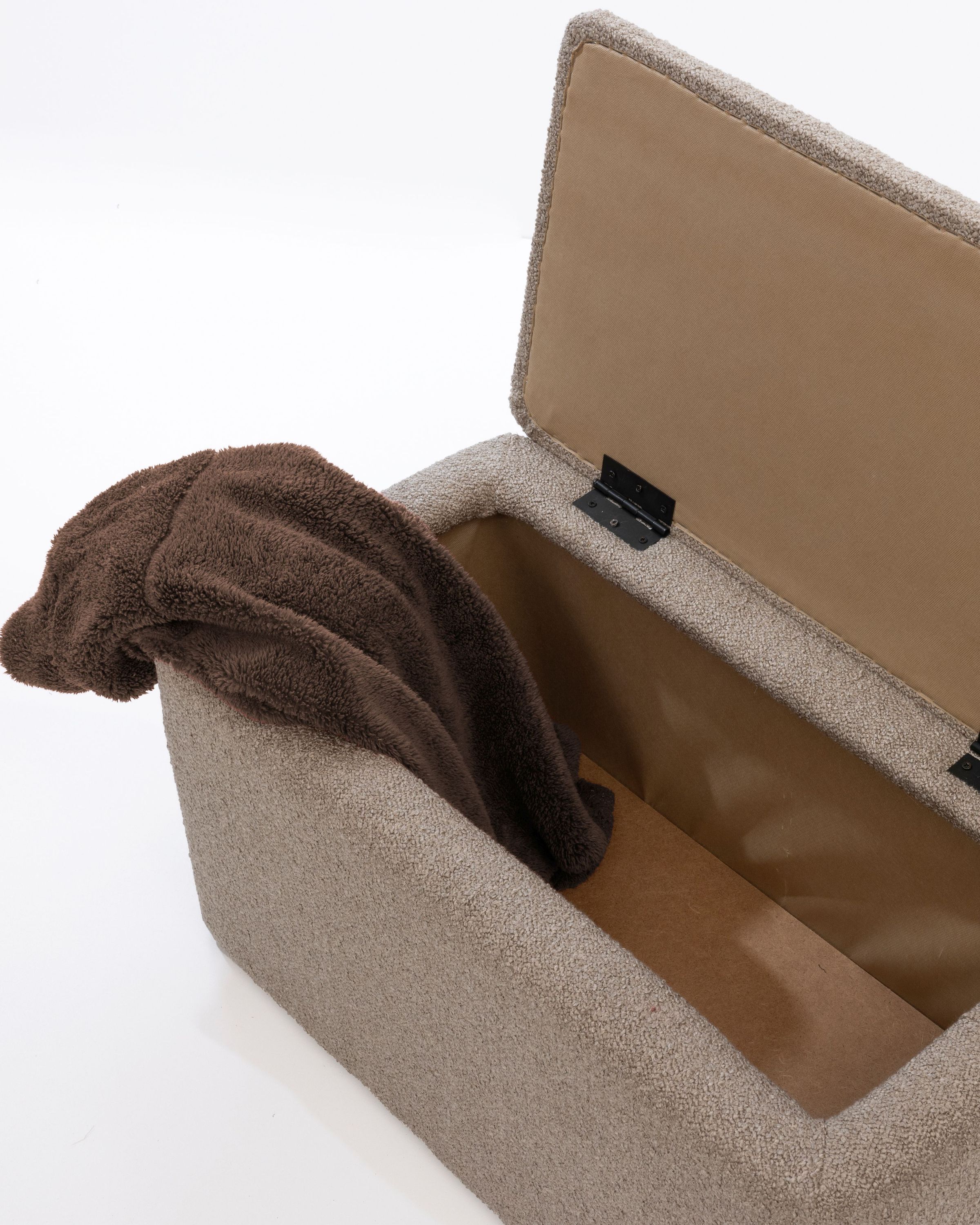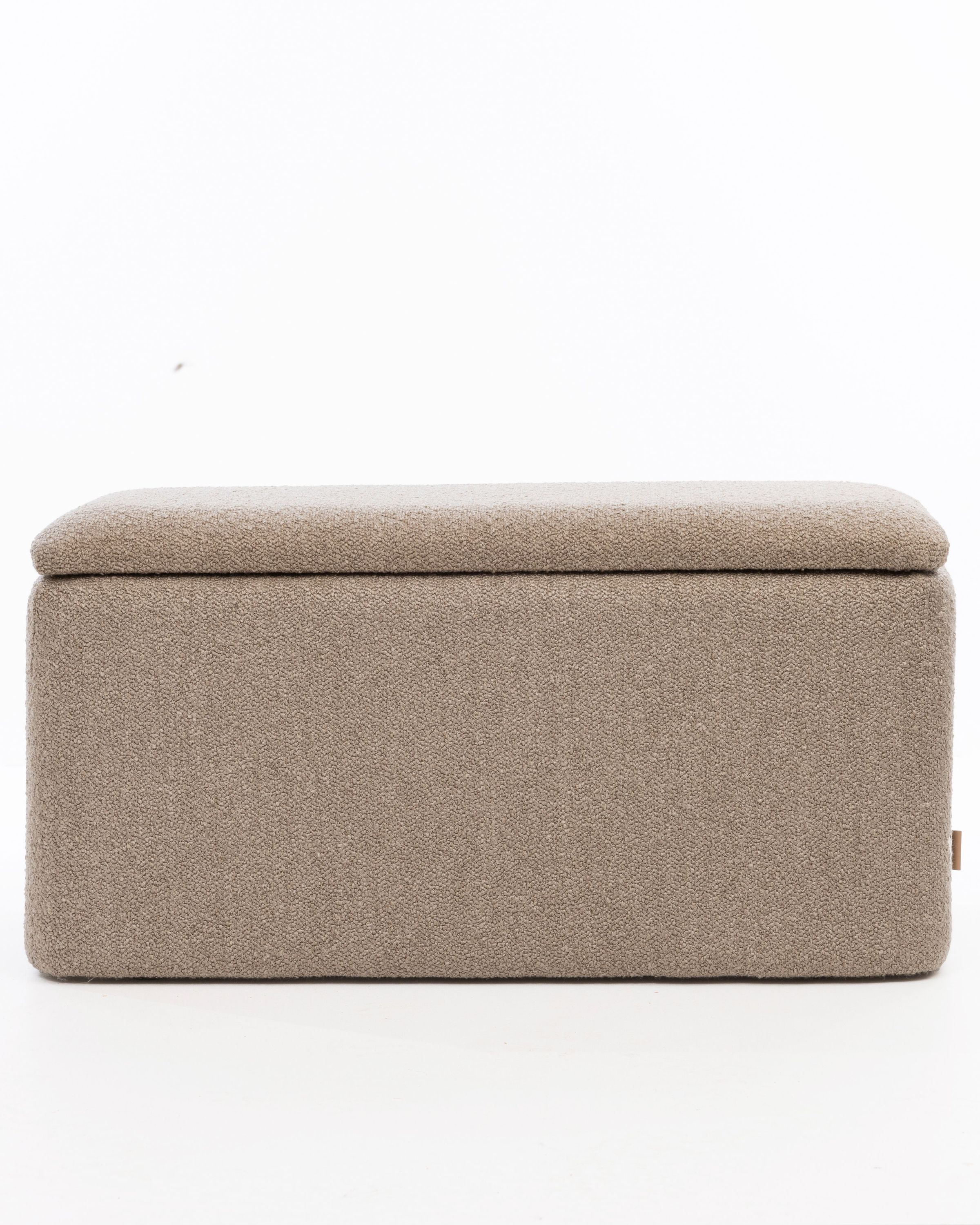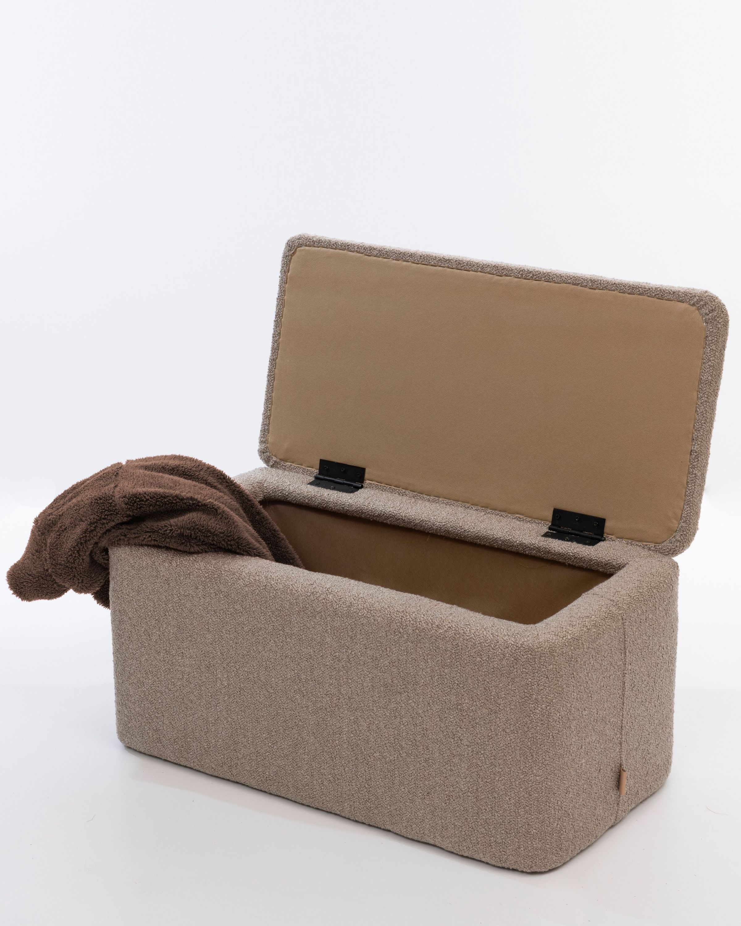 Rechteckiger Polsterhocker mit Stauraum – Sitzhocker – Fußhocker Bouclé Stoff Hellbraun Dieser stilvolle und funktionale Polsterhocker ist mit einem hochwertigen Bouclé-Stoff in Hellbraun bezogen und bietet zusätzlichen Stauraum. Der Stoff verleiht dem Hocker eine moderne und elegante Ausstrahlung, während das weiche Bouclé-Material für ein gemütliches und komfortables Sitzgefühl sorgt. Die stabile Konstruktion aus hochwertigem Holz sorgt für Langlebigkeit und Robustheit.