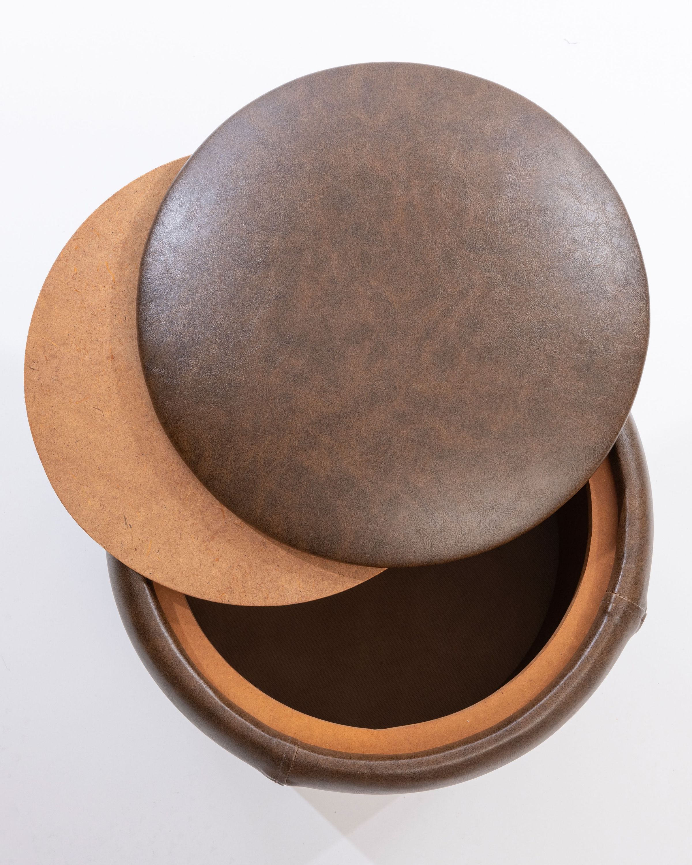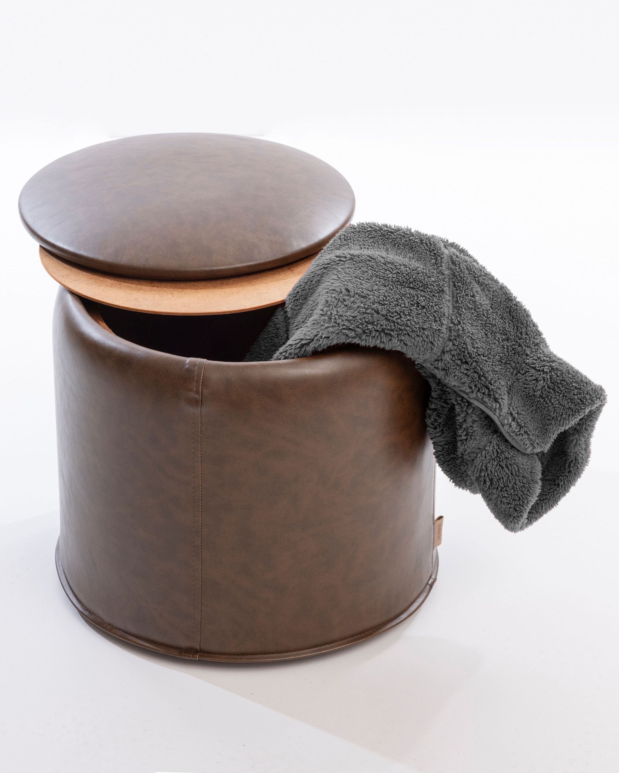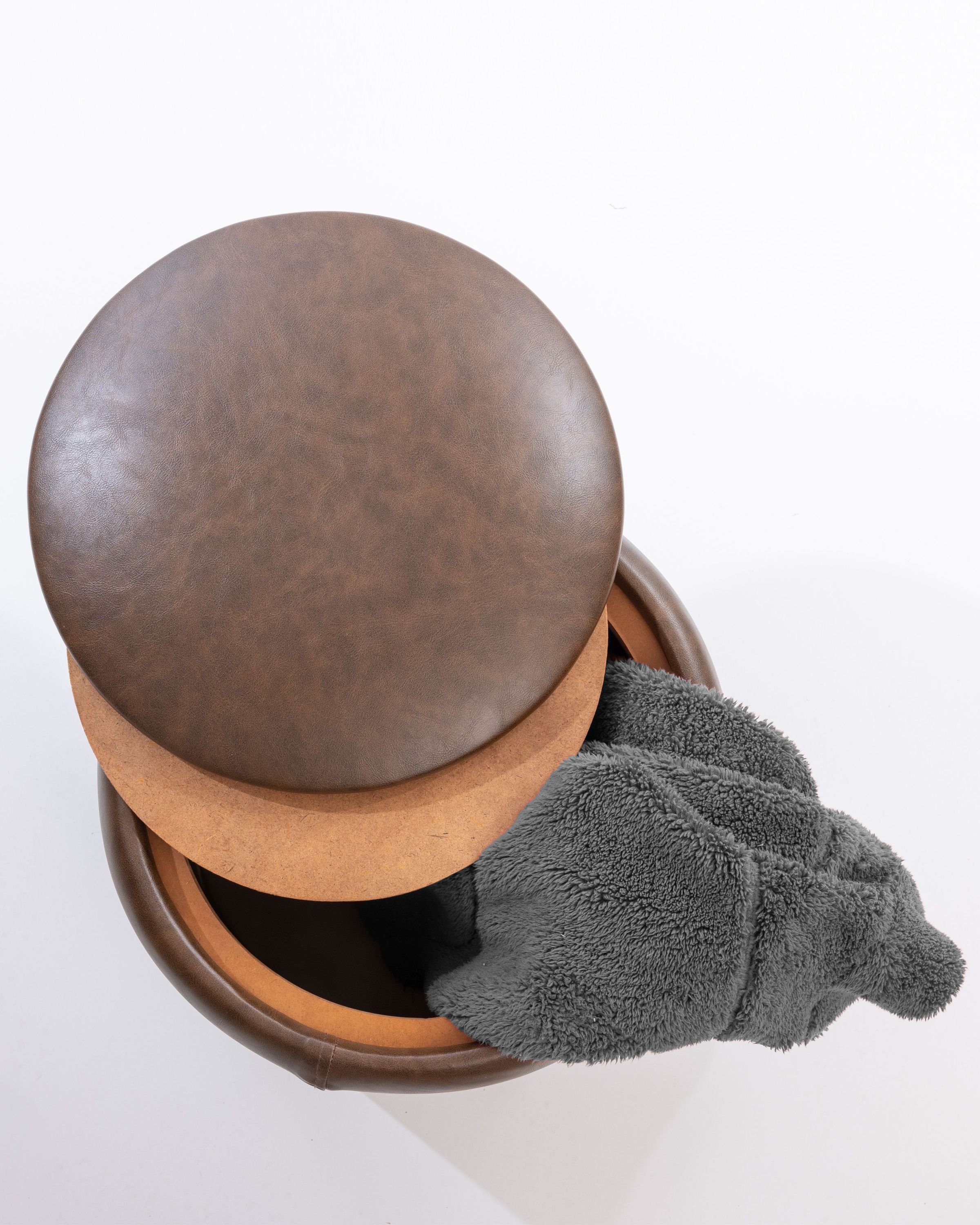 Runder Polsterhocker mit Stauraum und Tablettfunktion – Sitzhocker – Fußhocker Kunstleder Braun Dieser vielseitige Polsterhocker aus hochwertigem braunem Kunstleder kombiniert Stil und Funktionalität. Er kann sowohl als Sitzhocker, Fußhocker als auch als Beistelltisch genutzt werden. Der Deckel ist abnehmbar und dient gleichzeitig als Tablett, wodurch der Hocker noch praktischer wird. Das robuste Kunstleder verleiht dem Hocker einen modernen, eleganten Look, der perfekt in jedes Zuhause passt.