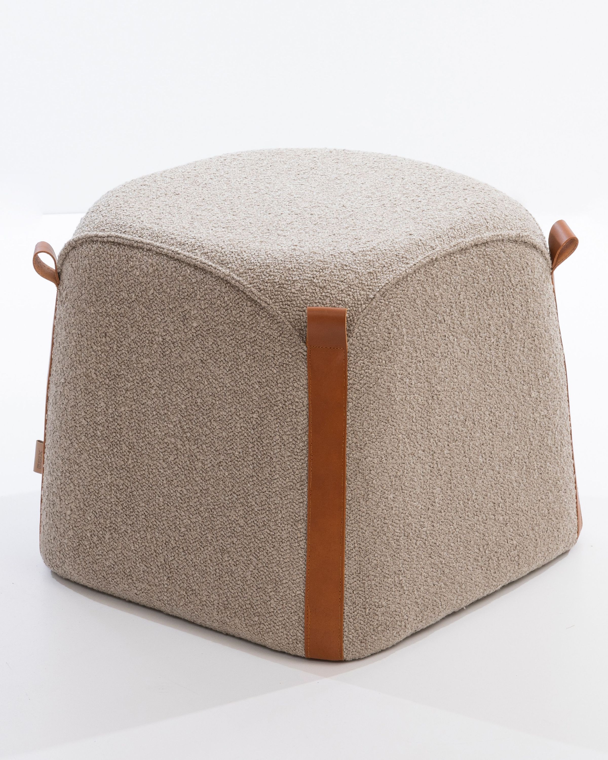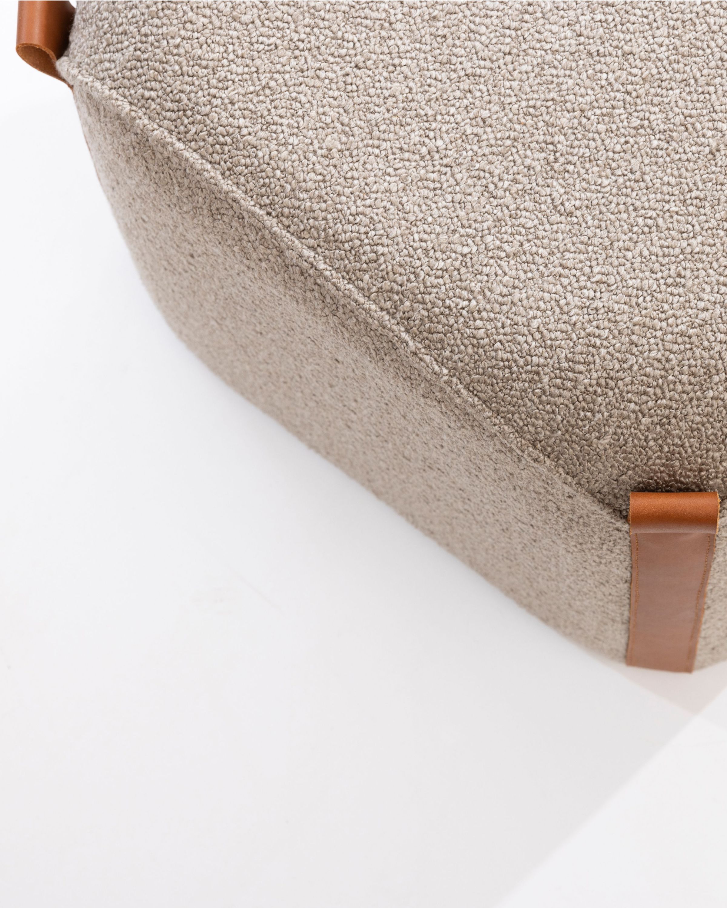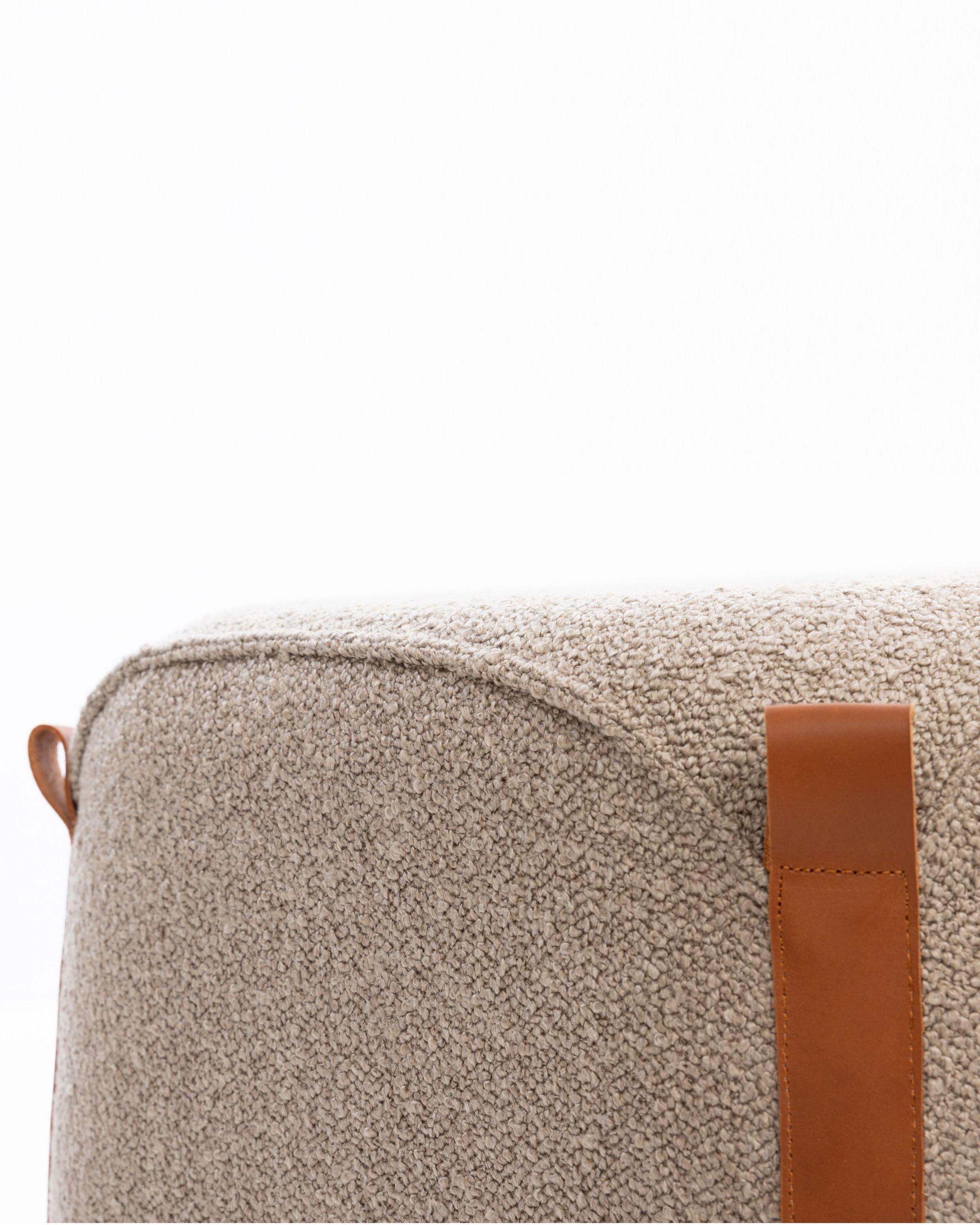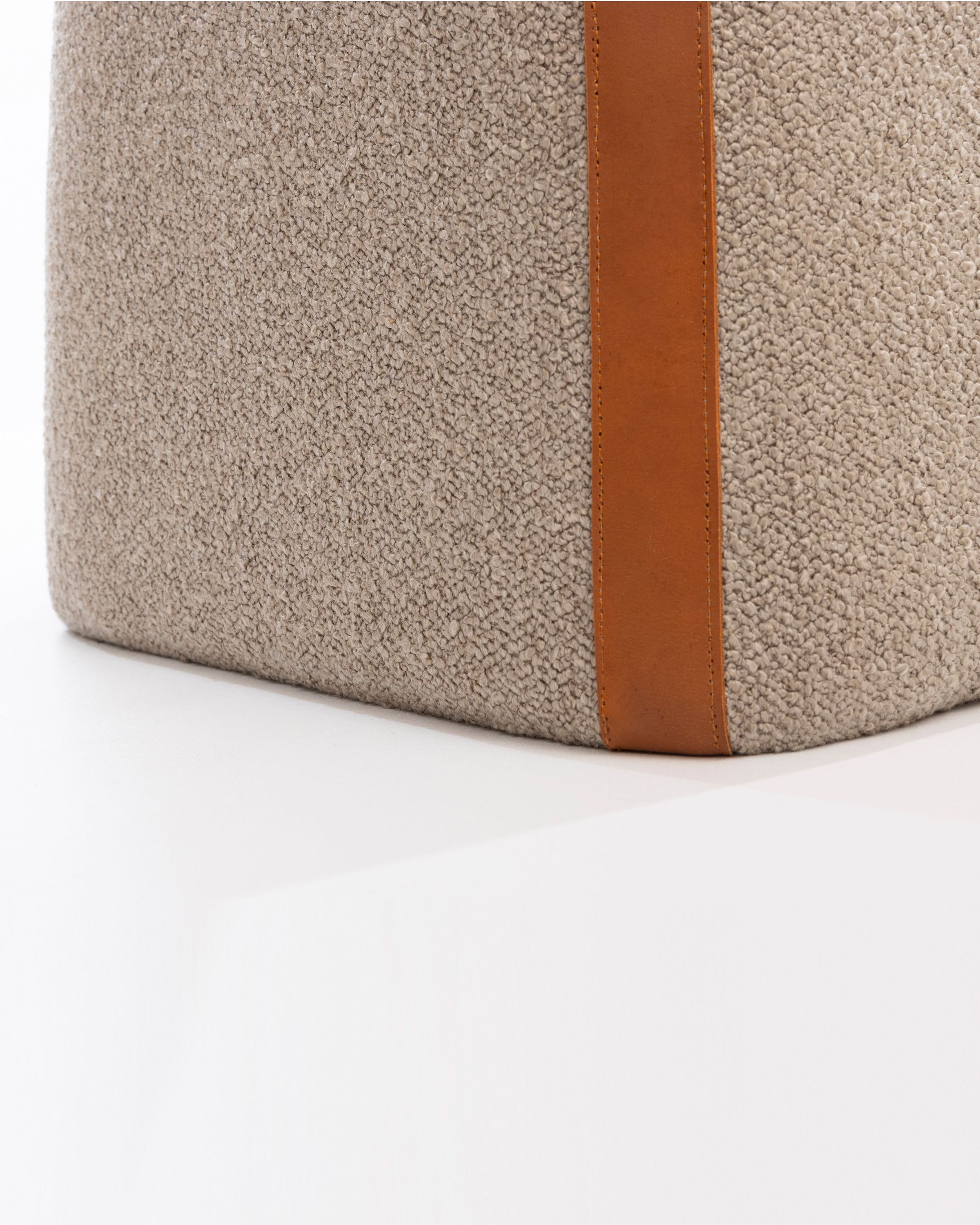Trapezförmiger Polsterhocker – Sitzhocker – Fußhocker Bouclé Stoff Hellbraun mit Echtlederstreifen Dieser stilvolle Polsterhocker in einer modernen Trapezform kombiniert hochwertige Materialien und ein einzigartiges Design. Der Hocker ist mit weichem Bouclé-Stoff in Hellbraun bezogen und an den Seiten mit Echtlederstreifen in Braun verziert, was ihm eine elegante und luxuriöse Ausstrahlung verleiht. Ideal als Sitzhocker, Fußhocker oder dekoratives Element in Wohn- und Schlafzimmern.