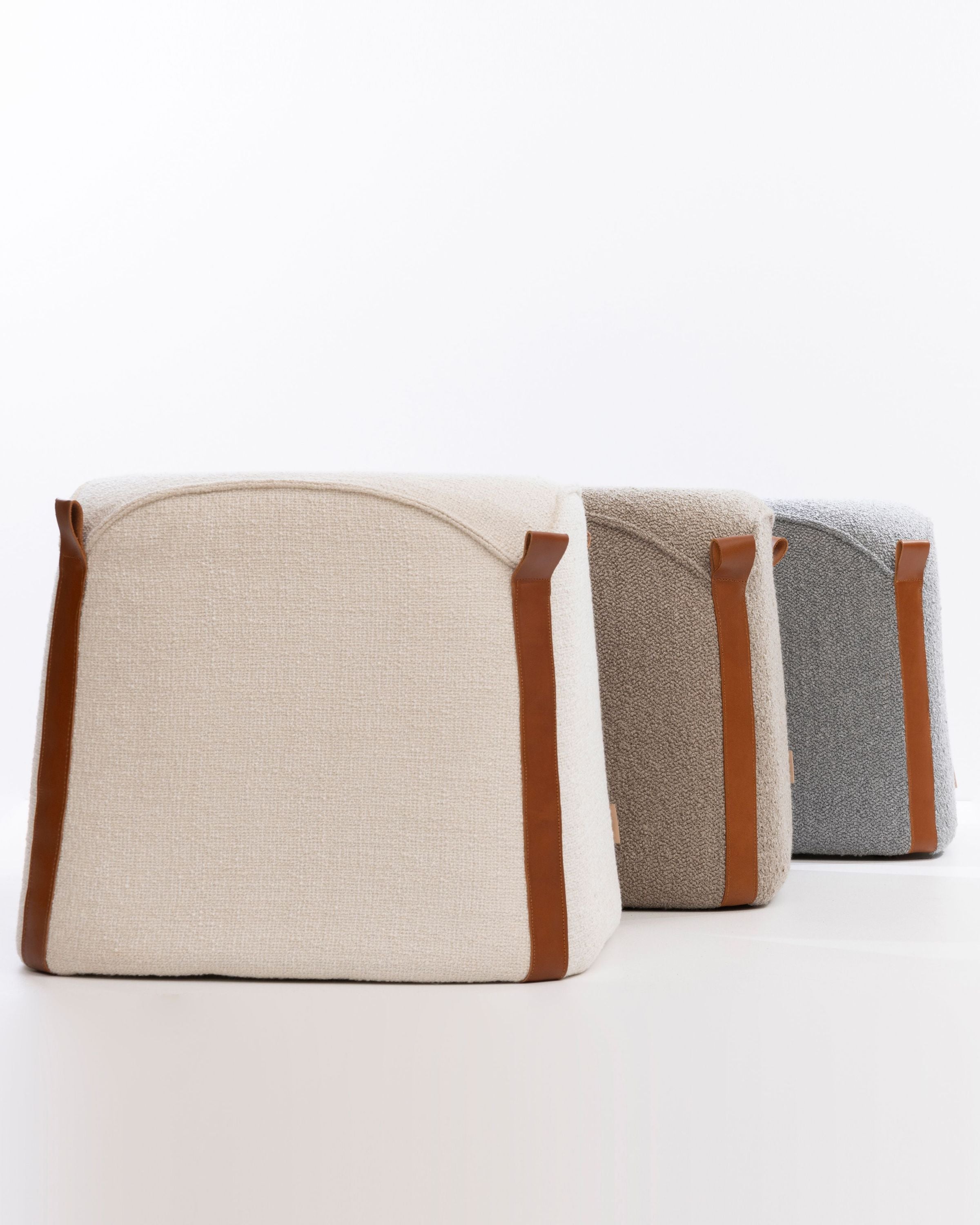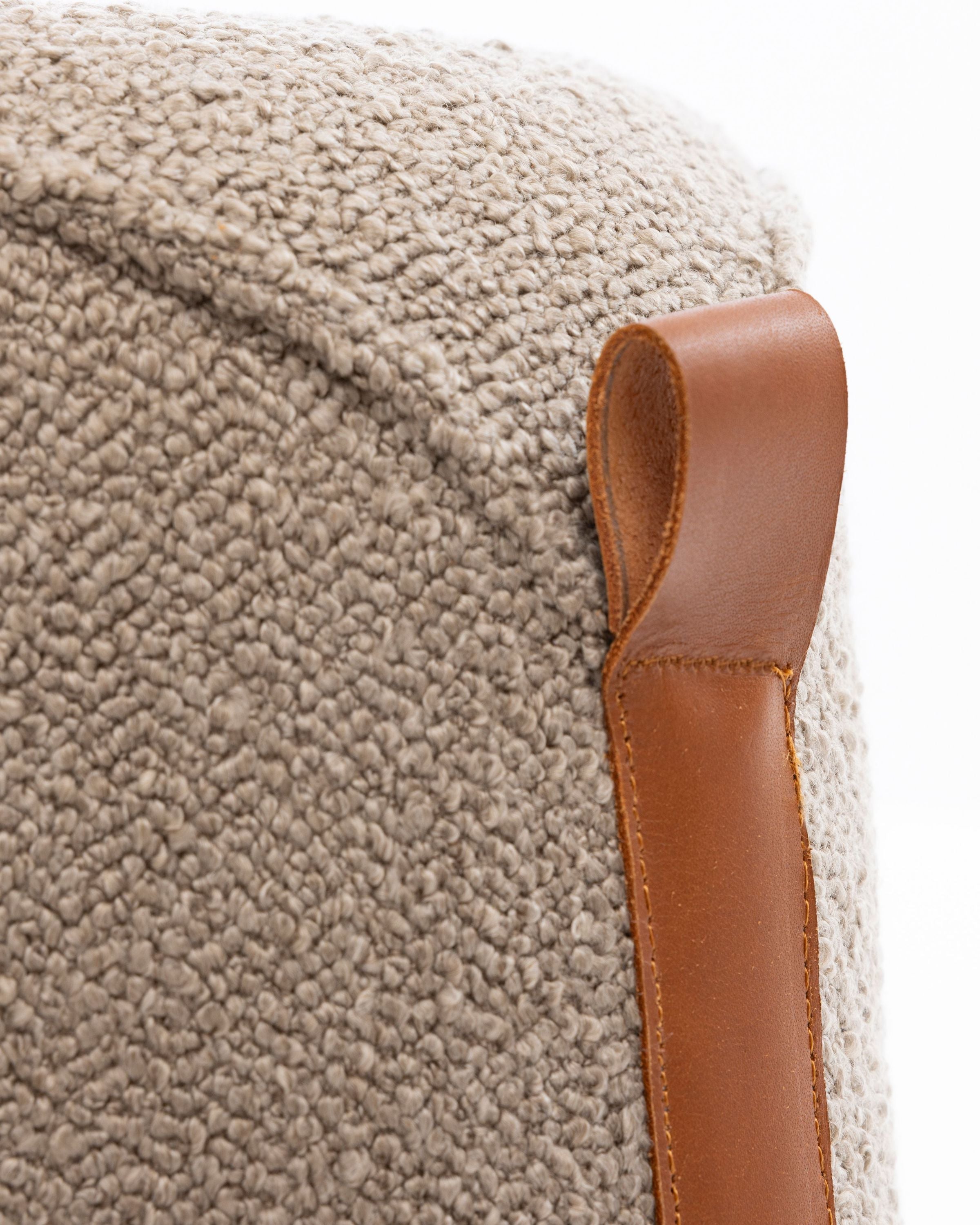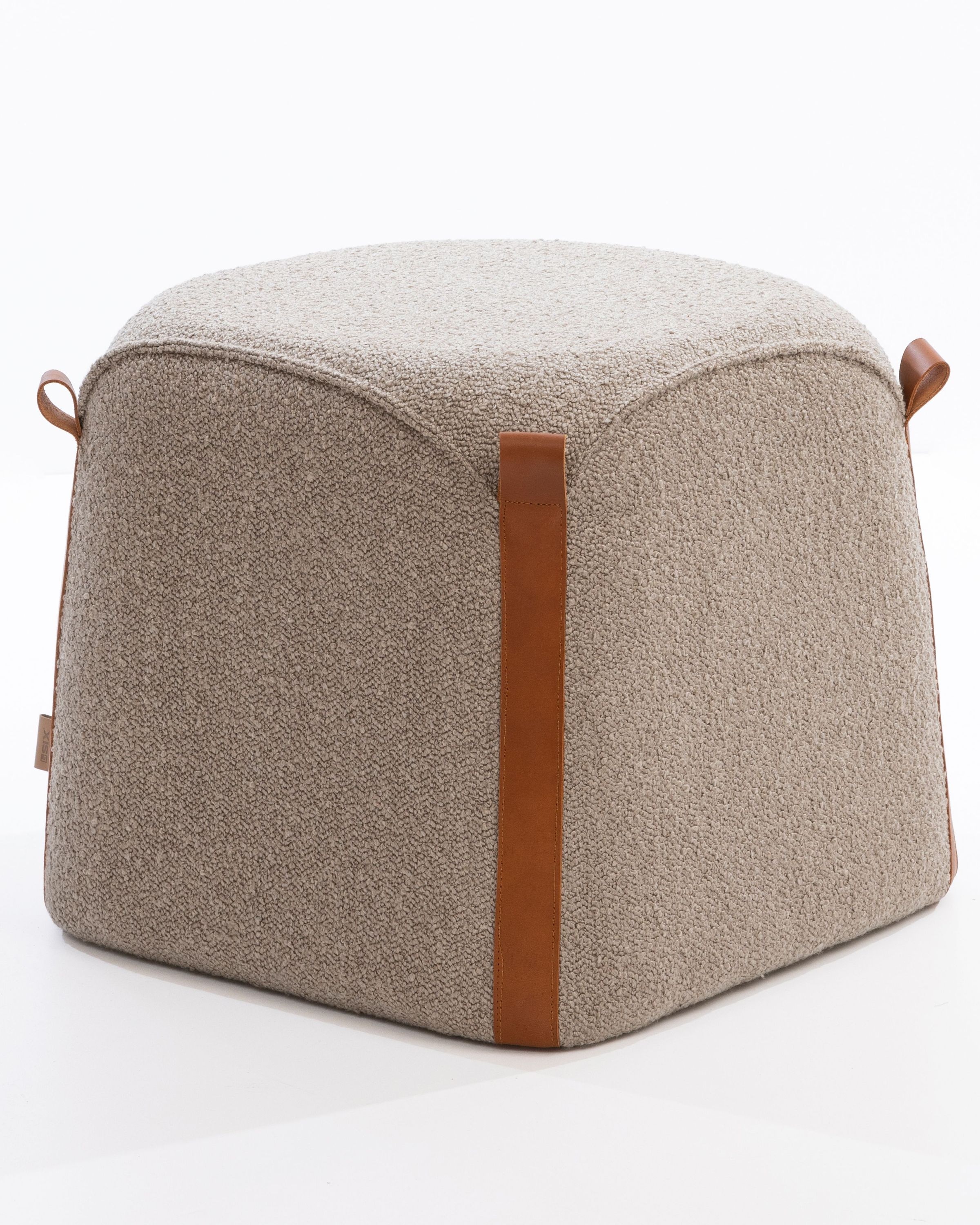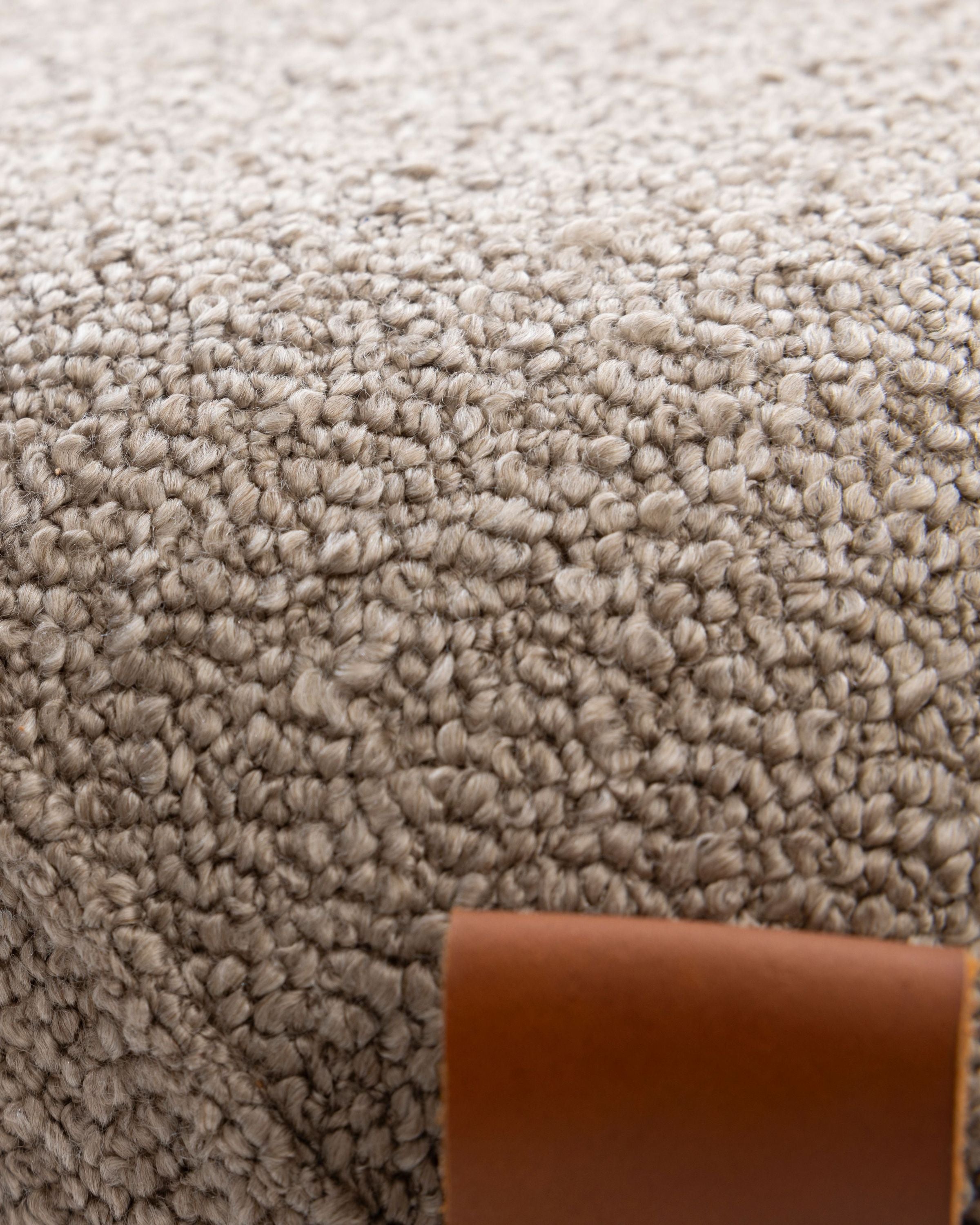 Trapezförmiger Polsterhocker – Sitzhocker – Fußhocker Bouclé Stoff Hellbraun mit Echtlederstreifen Dieser stilvolle Polsterhocker in einer modernen Trapezform kombiniert hochwertige Materialien und ein einzigartiges Design. Der Hocker ist mit weichem Bouclé-Stoff in Hellbraun bezogen und an den Seiten mit Echtlederstreifen in Braun verziert, was ihm eine elegante und luxuriöse Ausstrahlung verleiht. Ideal als Sitzhocker, Fußhocker oder dekoratives Element in Wohn- und Schlafzimmern.